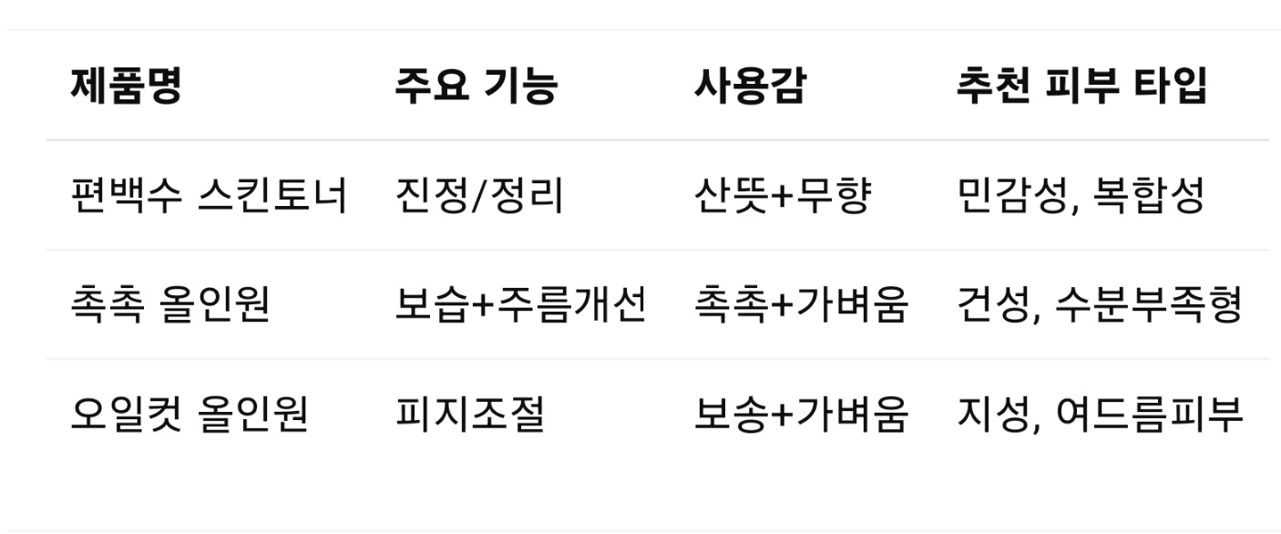이번 리뷰에서는 그중 편백수 스킨토너, 촉촉 초록 올인원, 보송 오일컷 올인원 총 세 가지 제품을 직접 사용해본 후기를 솔직하게 정리해볼게요.