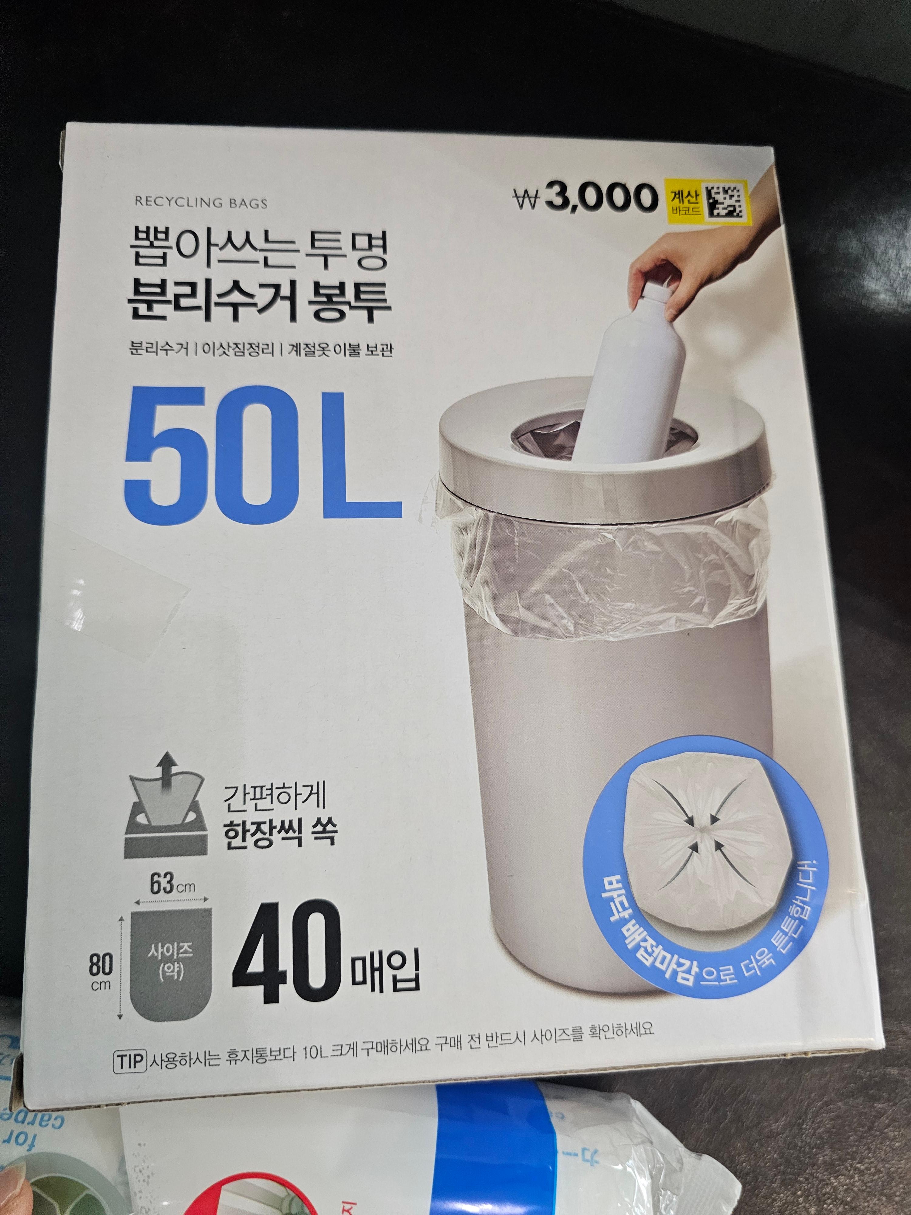 이번에 구입한 다이소 투명 분리수거 봉투는 50L 사이즈라 일반적인 가정용 쓰레기통에도 맞고, 분리수거용으로도 충분히 사용할 수 있었습니다.
