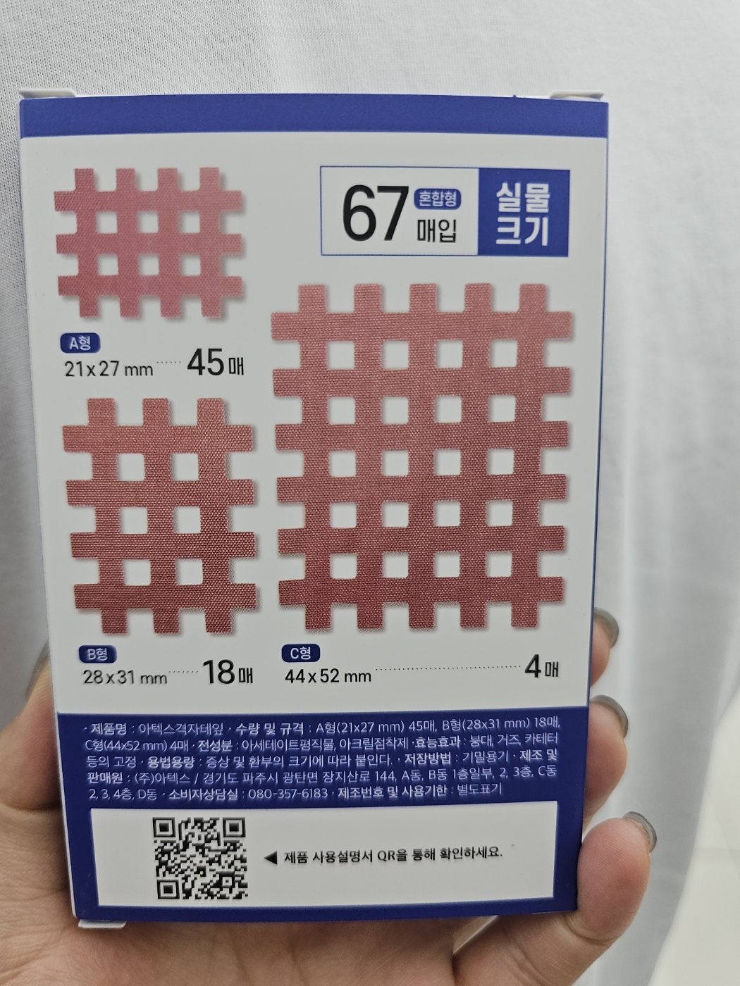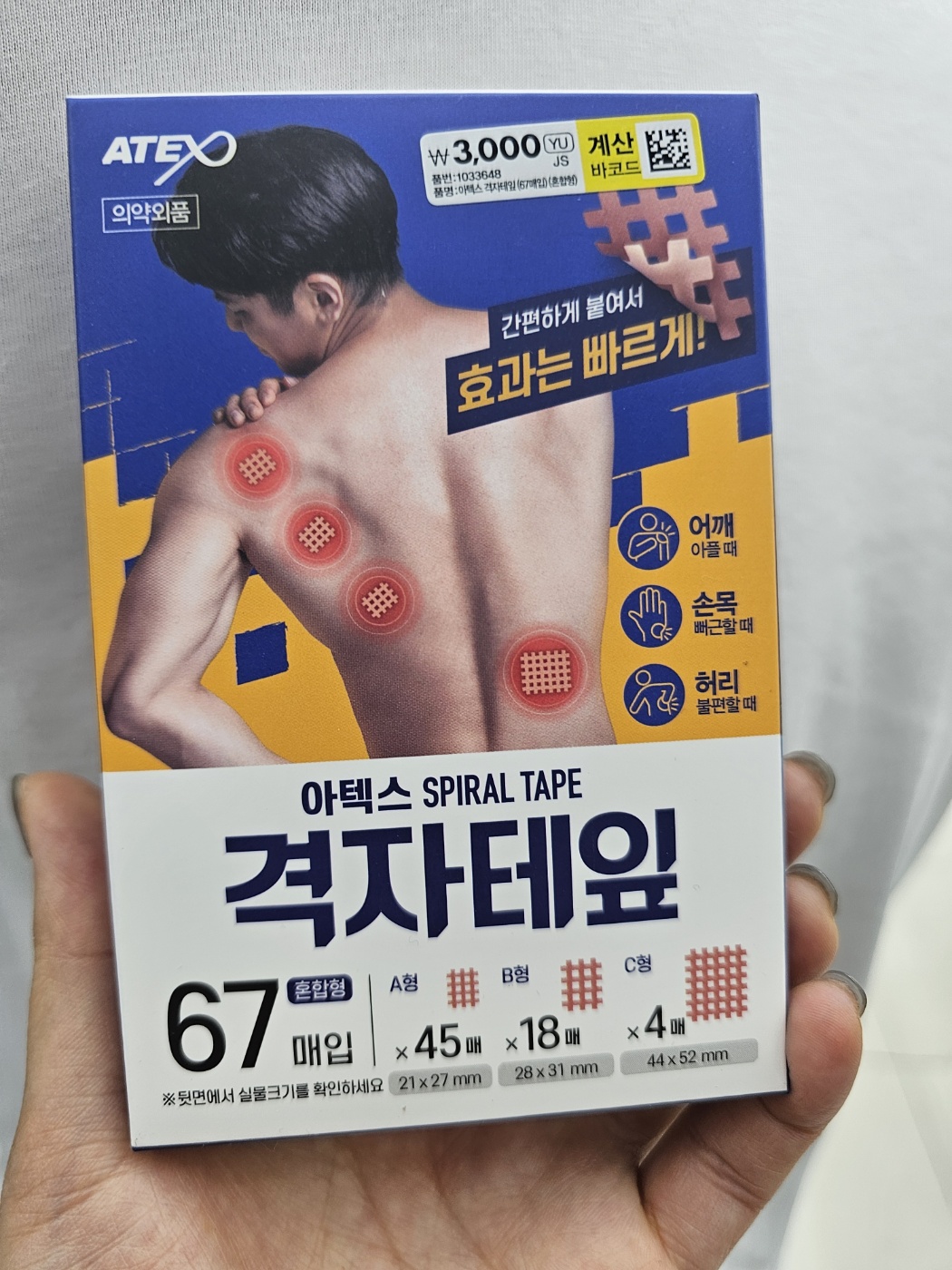 약 성분 없는 국내 제조 제품으로, 다양한 사이즈의 격자 테이프가 총 67매 들어 있어 일상 통증 케어용으로 아주 유용하더라고요.