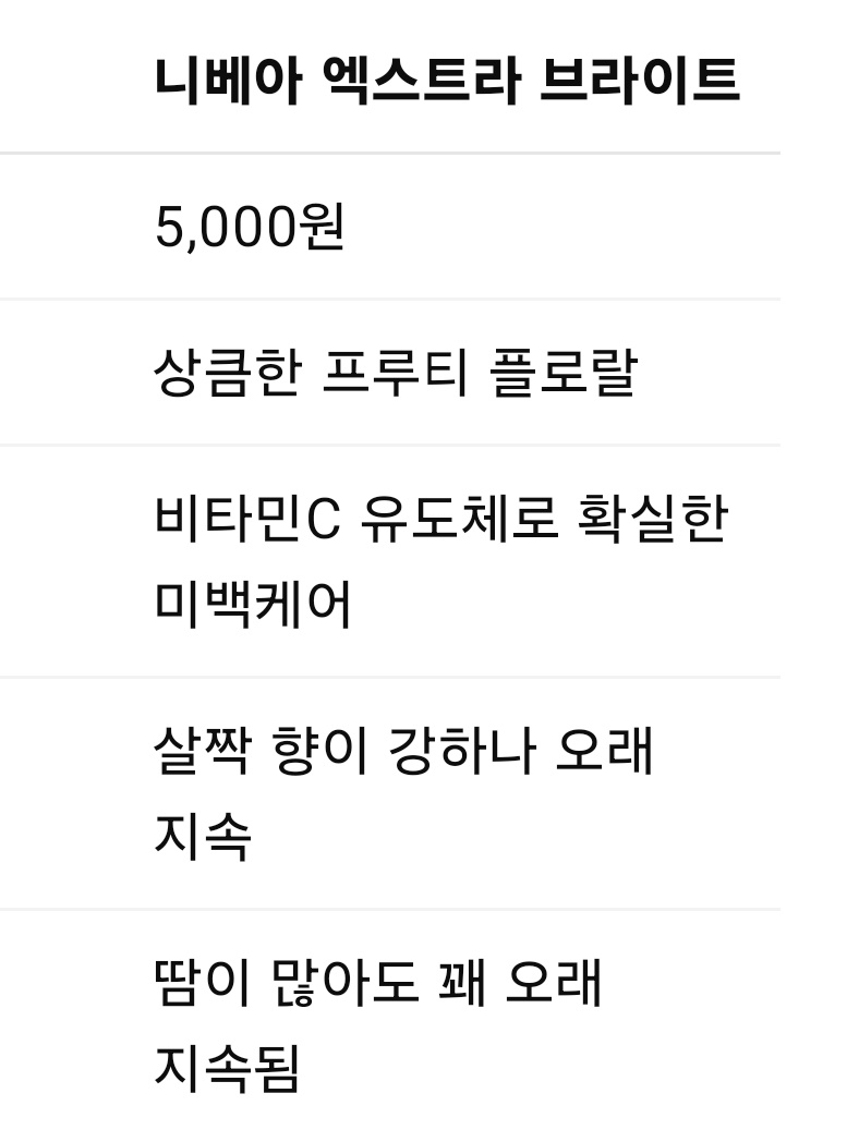 ✔ 니베아는 향 지속력과 미백 기능이 강점이라 확실한 효과를 원하는 분께 추천!